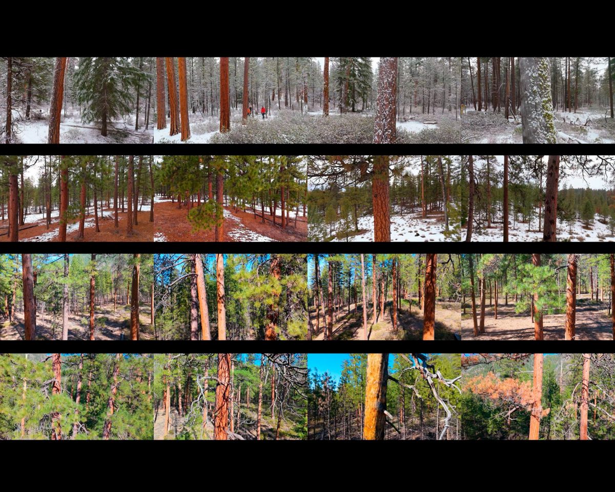 “Pondering” (2025-) is an ongoing, 4-channel video documentation of a field research site in the Deschutes National Forest by video artist Julia Oldham. To create “Pondering,” she visits the site every 2 to 4 weeks and takes numerous slow-motion drone shots, filming from the ground to the canopy. She stitch together 4 of these shots from (approximately) each month to create a ongoing, vertically moving portrait of seasonal changes. Nestled among the ponderosa pines that she is filming is a research tower, Ameriflux US-Me4, that is equipped with remote sensing tools utilized by scientists at Oregon State University. Scientists routinely climb this tower to install and adjust devices and to gather data.