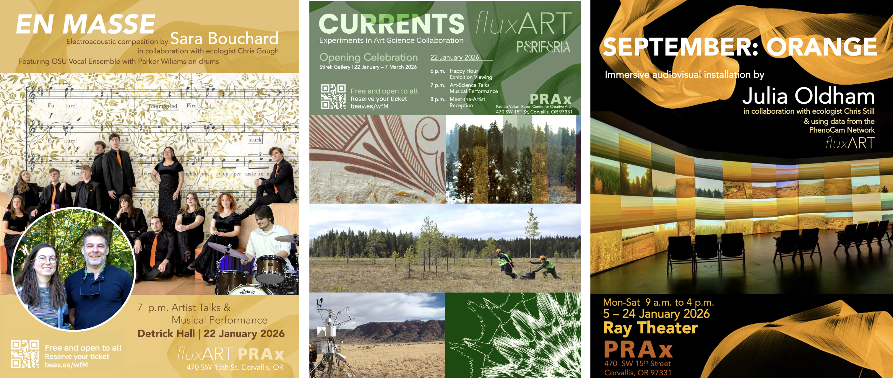 Meet the fluxART collaborations and join us for an opening celebration at the Patricia Valian Reser Center for Creative Arts (PRAx) on 22-23 January, 2026, Corvallis, OR.